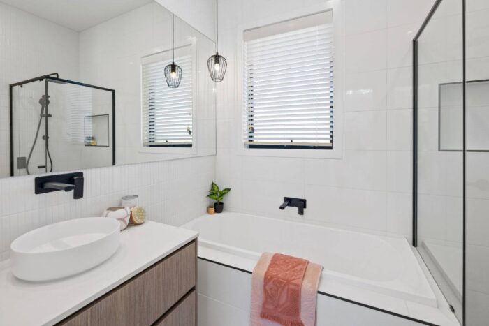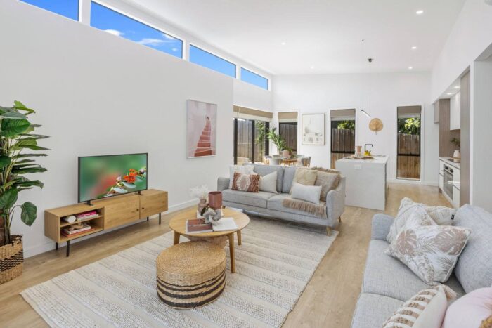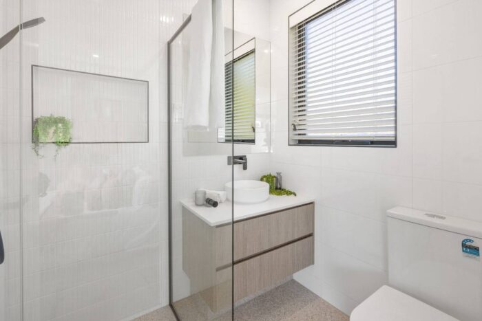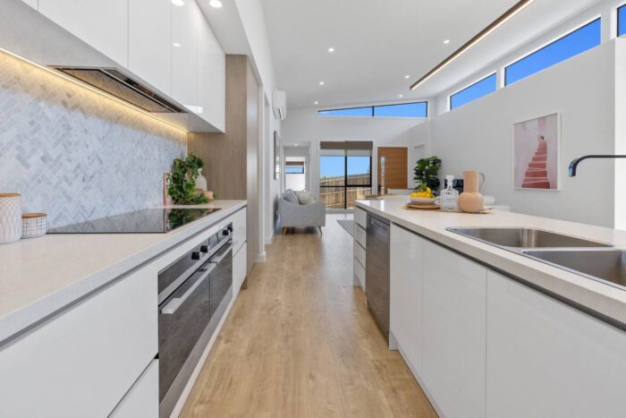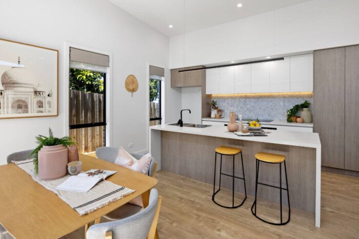 The footprint of this three-bedroom single-storey home is less than 200 square metres. The home’s sleek aesthetic of neutral tones, contemporary finishes and spaciousness are emphasised by the north facing statement windows, angled ceilings and additional highlight windows.