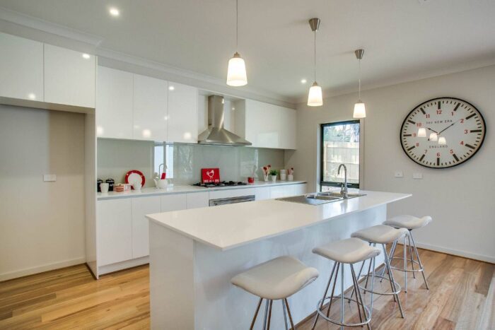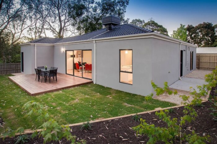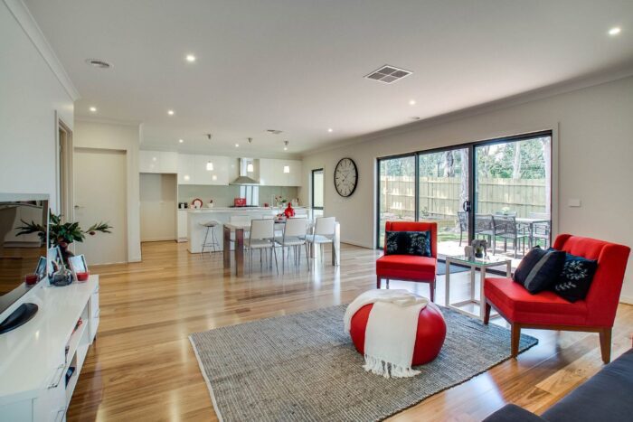 The subdivision transformed it into a stylish and low maintenance custom-built family home in Melbourne, plus unit with a large open living/meals area, and a view of already established trees.