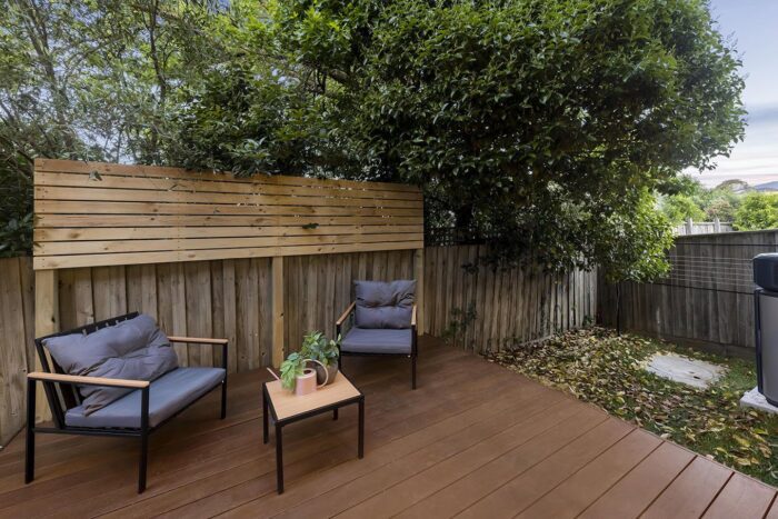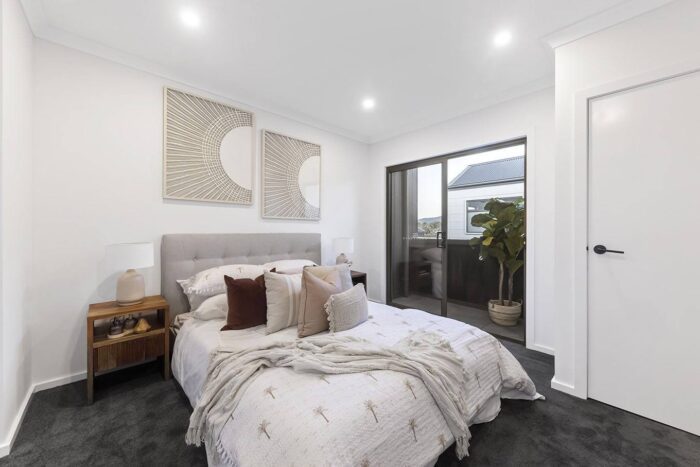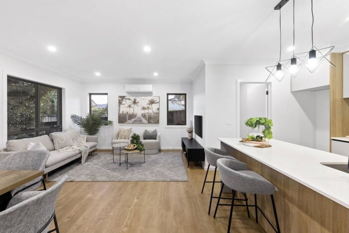 The seven architecturally designed townhouses feature a muted exterior palette drawn from the silvery-green tones of native eucalypts. This natural colour story flows seamlessly indoors, creating a cohesive and calming living environment that feels both modern and timeless.